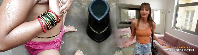 Indian house wife bathing outside with bang-out